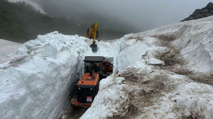 Rize'nin zirve noktalarında kışın izlerini taşıyan çığ kalıntıları, ekipler tarafından aralıksız olarak temizlenmeye devam ediyor.