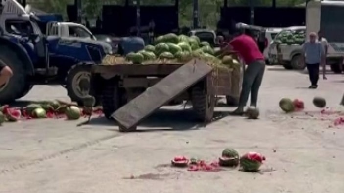 Fiyat politikası sebebi ile zarar ettiğini söyleyen bir çiftçi, römorkunda yüklü olan karpuzları pazarın ortasında tek tek yere fırlatarak parçaladı.