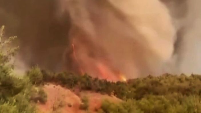 Karacabey'in paylaştığı görüntülerde, alevlerin dönerek gökyüzüne doğru yükseldiği, adeta bir ‘yangın hortumu' oluşturduğu anlar yer aldı.