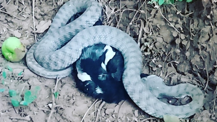 Türkiye’nin en zehirli yılanı olarak bilinen engerek, yakaladığı bir kargayı yerken görüntülendi.