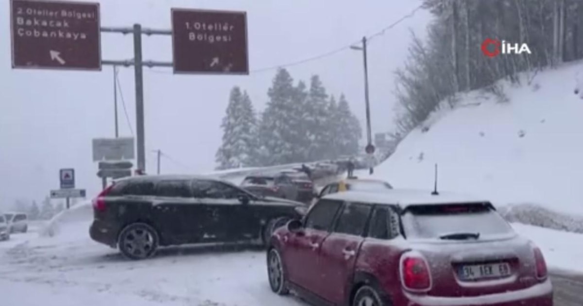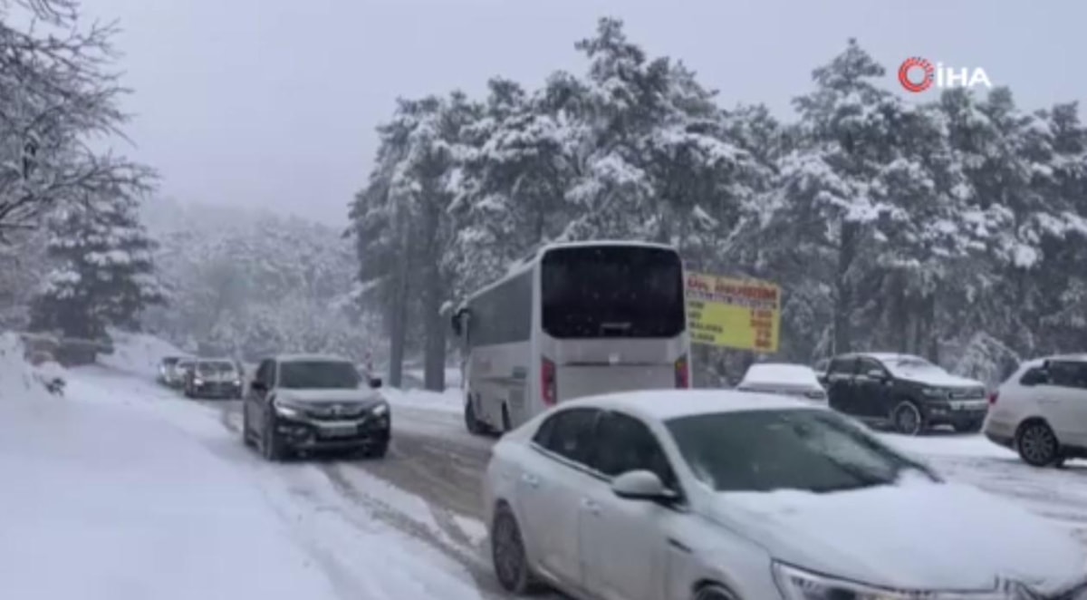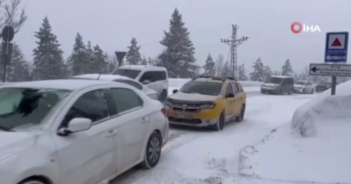 Uzun kuyruklar oluştuğu Uludağ’da, trafikte bazı araçlar adeta kayak yaptı.