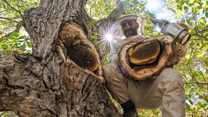 Ayrıca ağaç kovuğundaki yuvanın ağzını da testere yardımıyla kesip içindeki petekleri toplayan Semo, elde ettiği balı kutulara doldurarak yurt içinde ve yurt dışında sipariş veren müşterileri için hazırladı.