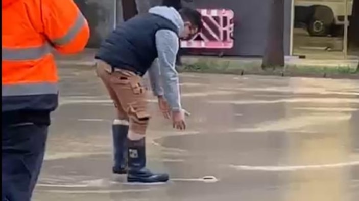 Yağış sonrası Çamdibi Barajı’nın açılmasıyla tersaneler bölgesindeki dere taştı. Yollarda oluşan birikintideki balıkları fark eden tersane çalışanı tatlı su sazanını elleriyle yakaladı.