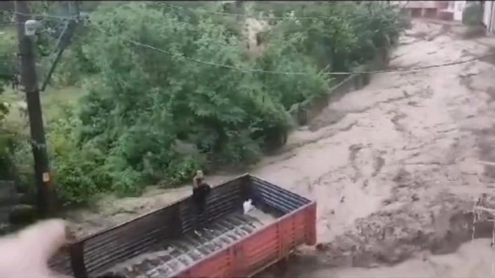 Görüntülerde, kamyon kasasında sel sularında mahsur kalan sürücü, vatandaş tarafından son anda kurtarıldı.