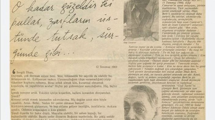 Şair Edip Cansever arkadaşı İlhan Berk'e duygu yüklü satırlar yazmış. Cansever, Berk'e "Tepelere çıkalım tepelere, uçmayı duymak için" dizeleriyle seslenmiş.
