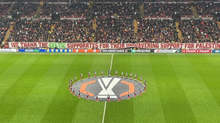 Sarı-kırmızılı taraftarlar, Doğu Tribünü’nde açılan pankartta, "Filistin’e olan sarsılmaz destekleri için Celtic taraftarlarına teşekkür ediyoruz" ifadelerine yer verdi.