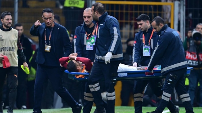 Oyuna devam edemeyen 31 yaşındaki futbolcu saha kenarına sedye getirildi.
