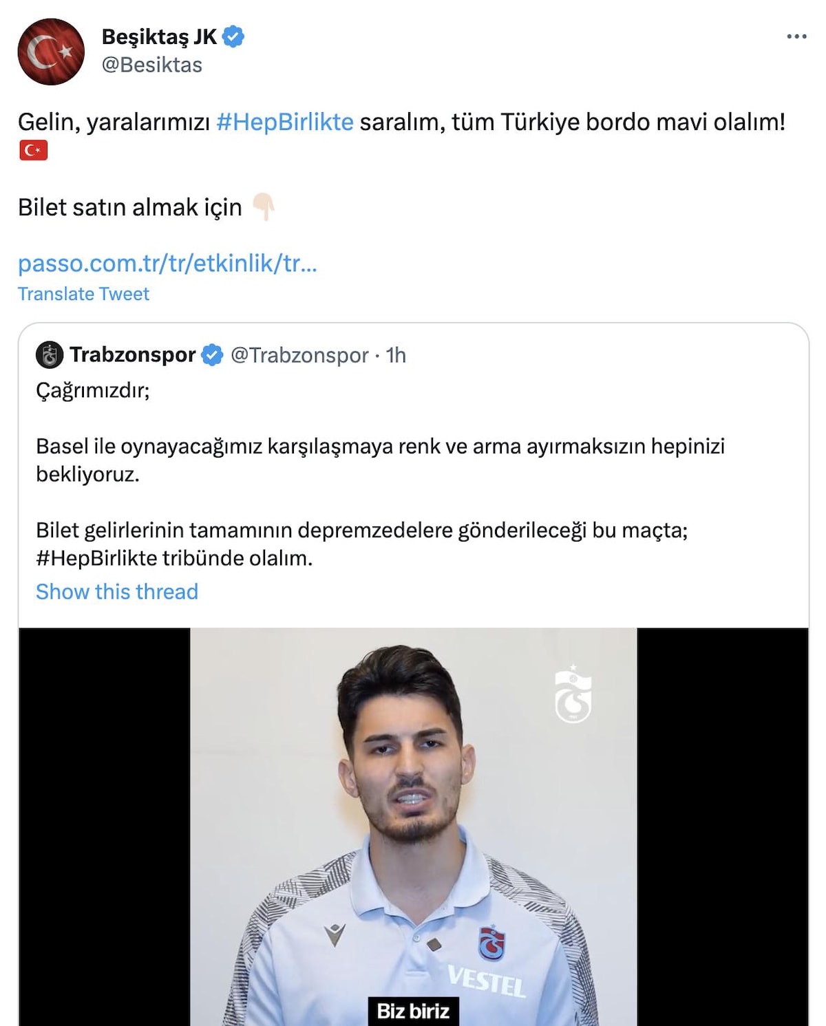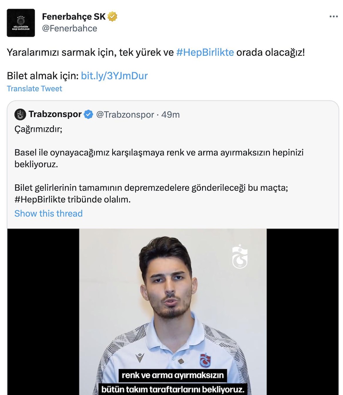 "UEFA Konferans Ligi'nde oynamak zorunda olduğumuz Basel maçına renk ve arma ayırmaksızın bütün takım taraftarlarını bekliyoruz. Biz biriz, hep birlikte daha güçlüyüz"