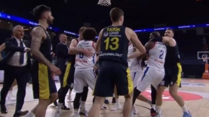 Anadolu Efes'in ABD'li oyuncusu Chris Singleton ile Fenerbahçe Beko'nun milli basketbolcusu Melih Mahmutoğlu arasında kavga çıkarken, Anadolu Efes'ten 2, Fenerbahçe'den 5 oyuncu atıldı.