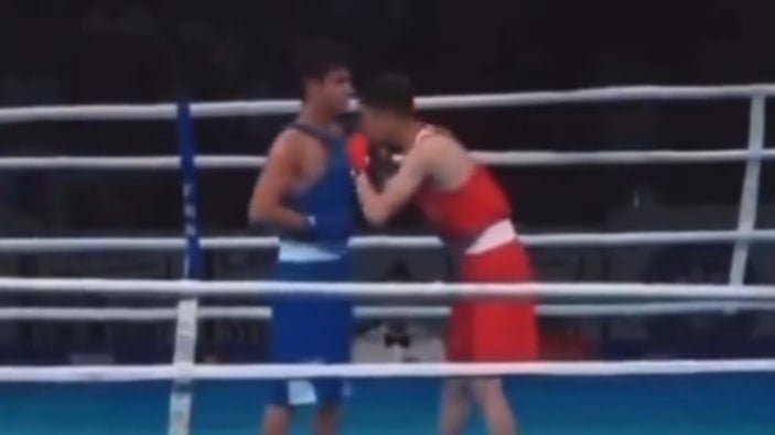 Türk boksçumuzu yenen Azerbaycanlı sporcu Subhan Babayev rakibinin göğsündeki Türk bayrağını öptü.