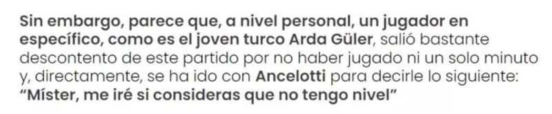 Ancak görünen o ki, kişisel düzeyde, özellikle bir oyuncu, genç Türk oyuncu Arda Güler, tek bir dakika bile oynamadığı için maçtan çok mutsuz ayrıldı ve doğrudan Ancelotti'ye gitti.