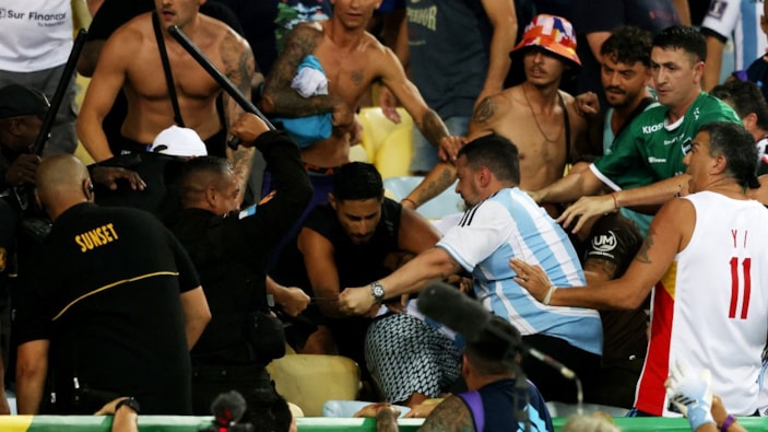 Maracana Stadı'nda oynanan Brezilya-Arjantin maçı, iki ülkeyi destekleyen taraftarların milli marşlar okunurken kavga etmeye başlaması üzerine yarım saat geç başladı.