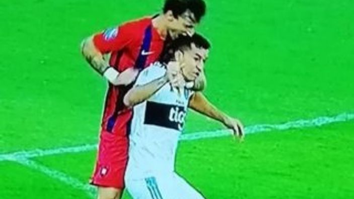Olimpia takımında top koşturan Paraguaylı oyuncu Nestor Camacho, ikili mücadele sırasında rakibinin kafasını ısırınca kırmızı kart gördü.