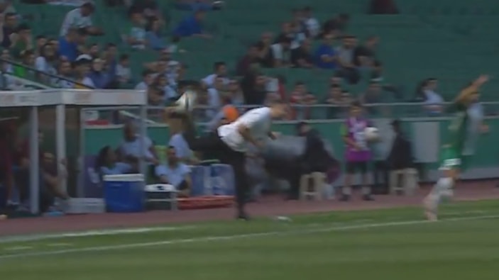 Mücadelenin 18. dakikasında Konyaspor'un genç teknik direktörü Ali Çamdalı, kendisine doğru gelen topu Fatih Terim'le özdeşleşen akrep hareketiyle karşıladı.
