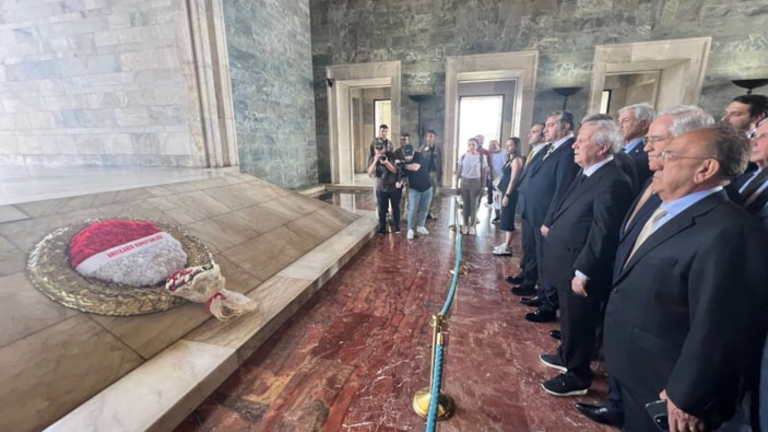 Aziz Yıldırım ve beraberindekiler, Atatürk'ün mozolesine çiçek bıraktıktan sonra dua etti.