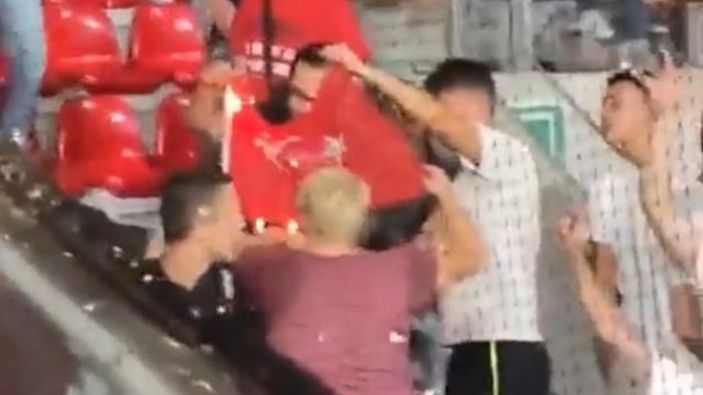 Elindeki çekpası rakip taraftara fırlatan Fenerbahçe formalı kişinin o anları sosyal medyada büyük ilgi gördü.