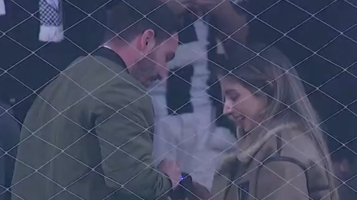 Maçın başlamasına dakikalar kala tribünlerde siyah-beyazlı bir taraftar, sevgilisine evlenme teklifi etti.