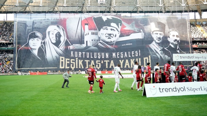Doğu tribününde açılan pankartta Mustafa Kemal Atatürk, annesi Zübeyde hanım, kız kardeşi Makbule hanım ve Mareşal Kazım Karabekir'in fotoğraflarının yanı sıra 'Kurtuluşun Meşalesi Beşiktaş’ta Yakıldı' yazısı yer aldı.