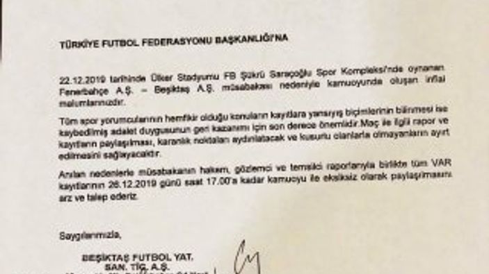 Yapılan başvuruda, "Fenerbahçe maçının hakem, gözlemci ve temsilci raporlarıyla birlikte tüm VAR kayıtlarının 26 Aralık 2019 saat 17.00'ye kadar açıklanması arz ve talep ederiz." denildi.