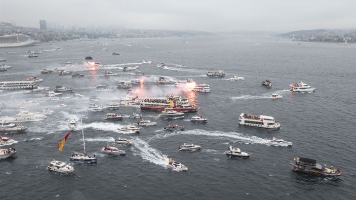 Galatasaray futbolcuları ve teknik ekibi, Sarayburnu’ndan hareket eden tekneyle boğaz turu yaparak Yenikapı’daki taraftarlarıyla buluştu. Yolculuk boyunca taraftarlar meşale ve havai fişeklerle takıma destek verdi.