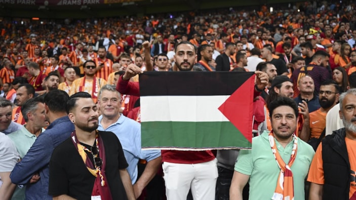 Bazı Galatasaraylı taraftarlar, İsrail'in Gazze'de yaşattığı katliamlara karşı Filistin'e destek için tribünlerde Filistin bayrağı açtı.