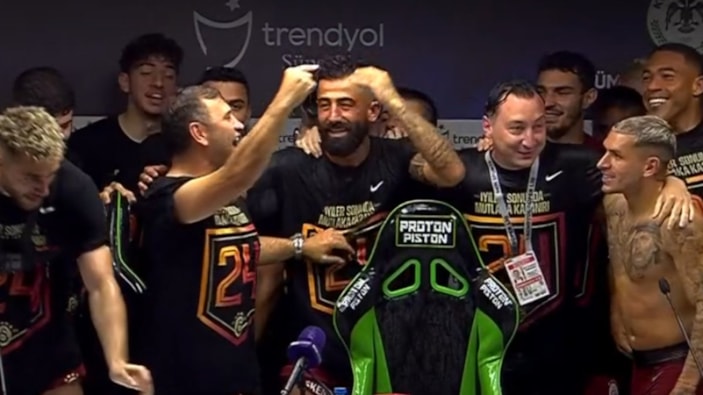 Süper Lig'in 2023-2024 sezonunu şampiyon tamamlayan Galatasaray'da futbolcular, Okan Buruk'un basın toplantısını su şişeleriyle bastı.
