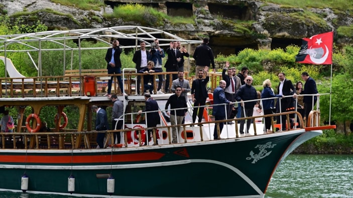 Tekne turuyla Halfeti'ye gelen Özbek ve beraberindekiler, bölgede fotoğraf çektirdi.