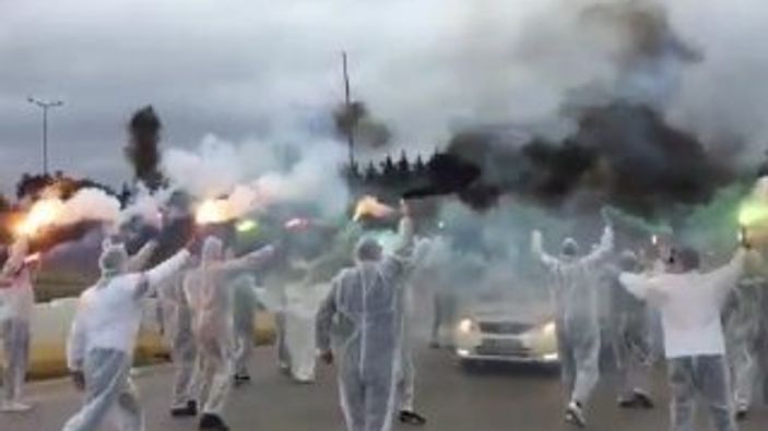 Beyaz renkli koruyucu kıyafetler giyen taraftarlar, yeşil-siyah renkte meşaleler yakarak takım otobüsünün önünü kesti.
