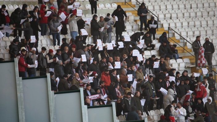 Vefat eden öğretmenlerin fotoğrafları ekranlarda gösterilirken, Hatayspor taraftarı ise öğretmenlerin adı yazılı pankart hazırladı.