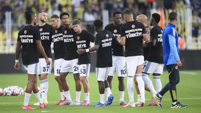 Fenerbahçeli futbolcular, yaşanan deprem ve yangın felaketleri sebebiyle ısınmaya "Geçmiş olsun Türkiye" yazılı siyah tişörtlerle çıktı.