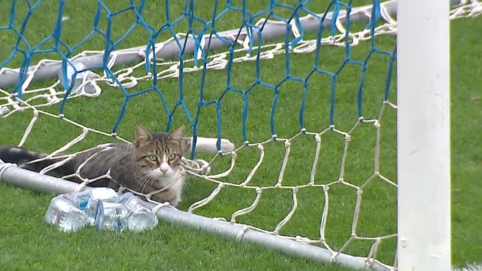 Karşılamanın ikinci yarısında ise ortaya çok renkli görüntüler çıktı. İstanbul'da oynanan mücadelenin 56. dakikasında sahaya giren bir kedi, Kasımpaşa'nın hücum yaptığı kalenin arkasındaki filelere takıldı.