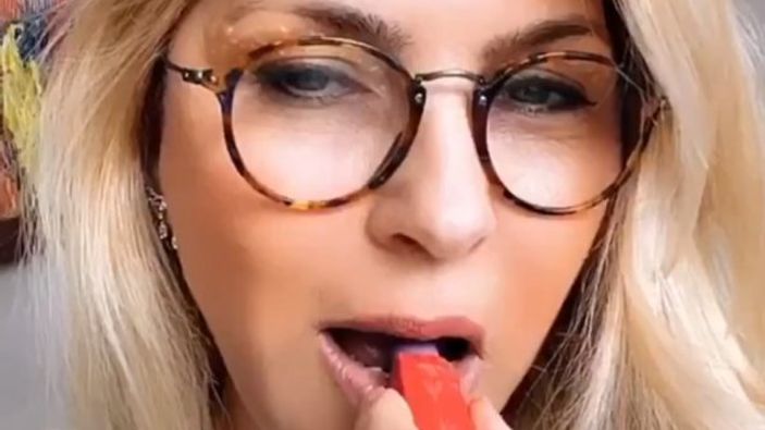 Makyajını soranlar için bir video çeken Arzu Sabancı, ruj şeklinde çikolatayı yemeye başladı ve gülümsedi.