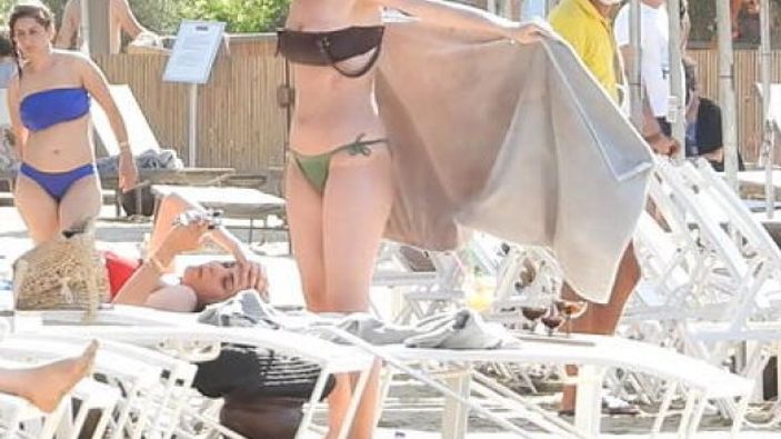 Üstsüz güneşlenen Aslıhan Güner, kadın arkadaşına güneş kremi sürdürdükten sonra sonra yüzüstü yatarak saatlerce güneşlendi. Güner, daha sonra denize girerek ferahladı.