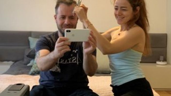 Korona yüzünden 1 aydır berbere gidemeyen Emre Aydın, çözümü saçlarını eşi Eda Köksal Aydın’a emanet etmekte buldu.