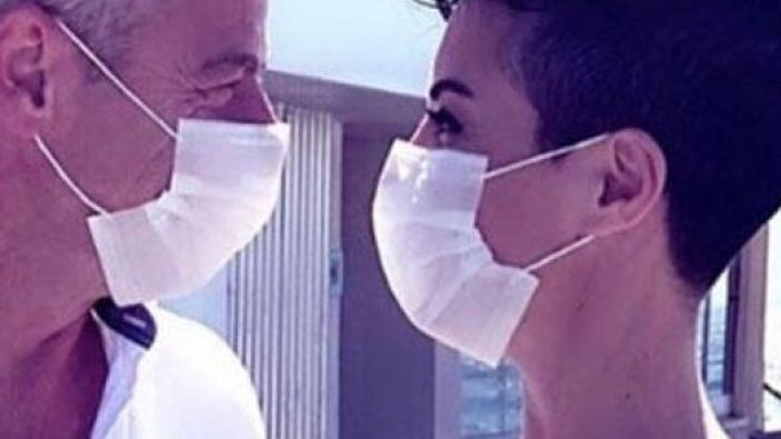 Çift, İzmir'de gerçekleşen nikah sonrası yüzlerinde maskelerle bu pozu verdi. İddiaya göre Levent Yüksel, eşiyle konserinde tanıştı.