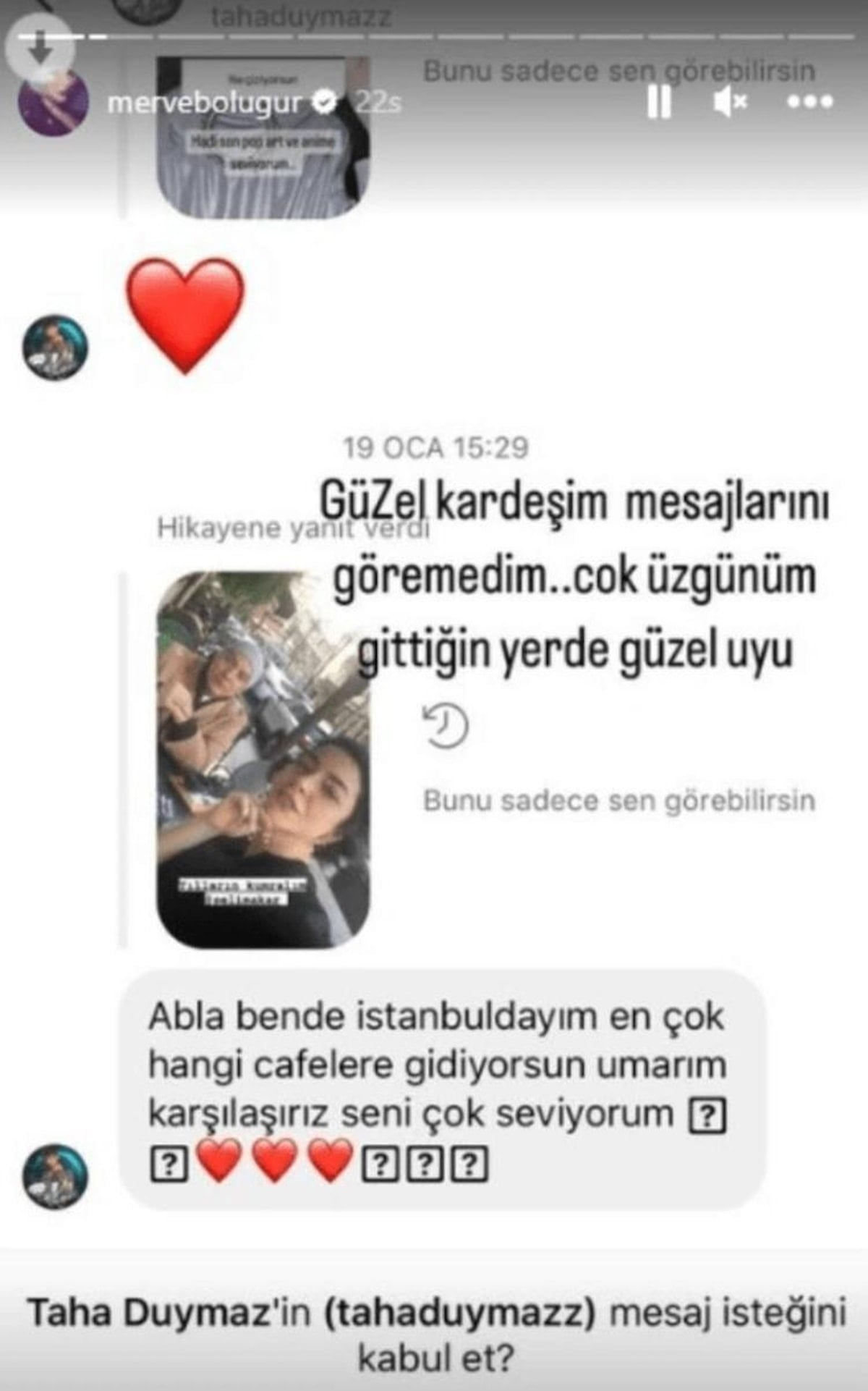 Taha'nın attığı "Abla ben de İstanbul'dayım. En çok hangi kafelere gidiyorsun. Umarım karşılaşırız. Seni çok seviyorum" yazılı mesajını paylaşarak yaşadığı üzüntüyü dile getiren Boluğur, "Güzel kardeşim, mesajlarını göremedim. Çok üzgünüm. Gittiğin yerde güzel uyu!" dedi