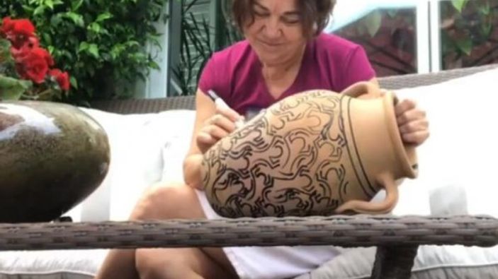 Nazan Öncel korona günlerinde boş durmuyor. Daha önce sutyenden maske dikip paylaşan Öncel, bu kez bir kil vazonun üzerine resim çizerken bir kare paylaştı.