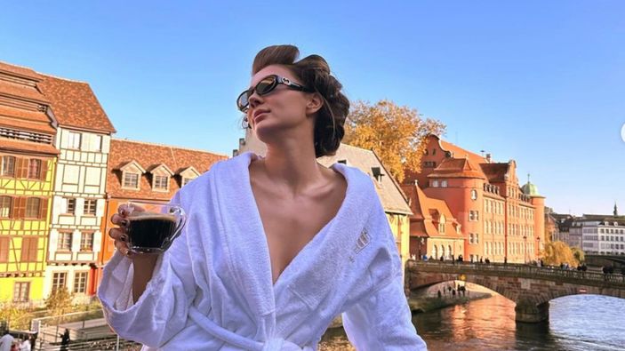 Her verdiği pozla her paylaştığı gönderiyle gündem olan Özberk, bornozunu giydi; Fransa'da kaldığı yerin balkonunda pozlar verdi.