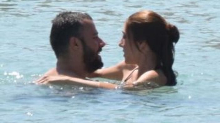 Sıcaktan bunaldıkları için uzun süre denizden çıkmayan Salih Bademci ve İmer Özgün’ün romantik anları, objektife yansıdı. İkili, görümtülendiklerini fark edince denizden çıkıp otellerine döndüler.