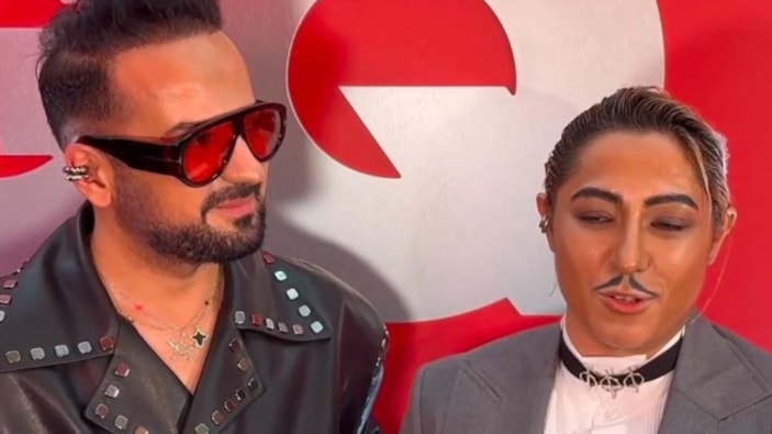 Bıyık makyajı ile kameraların karşısına geçen ünlü şarkıcı Kalben, davetli olduğu bir geceye erkek kılığında katıldı.
