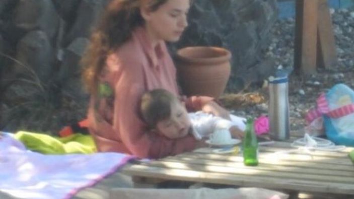 Kucağında kızıyla Türk kahvesi içerken objektife yansıyan Seda Bakan, daha sonra fal baktırmak için fincanını kapattı.