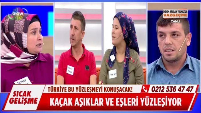 Nuray'ın kocası Himmet'in kaçtığı Oya'nın da kocası canlı yayına geldi. Kocası ve karısı kaçan Nuray ve Ali, canlı yayında kaçak eşleriyle yüzleşti.
