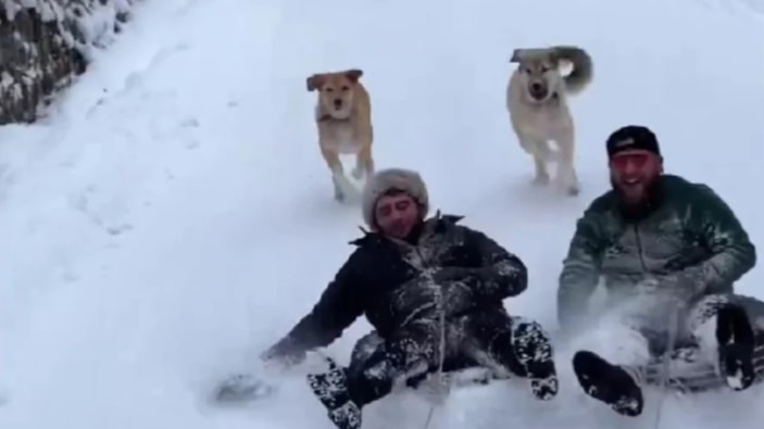 Kızakla kayan gençlere köpek sürprizi! Peşlerine düştüler...
