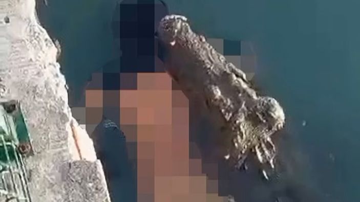 Dev bir timsah, lagünde bir cesedi sürüklerken görüntülendi. Görüntülerde, cesedin vücut bütünlüğünün olmadığı görüldü.