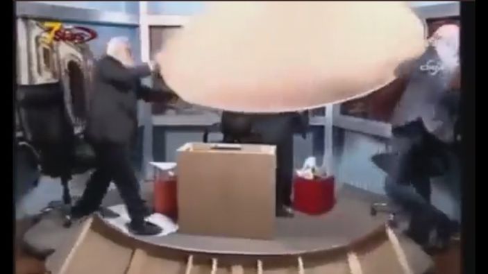 Videoda bir Arap televizyonunda politikacı oldukları tahmin edilen konukların tartışması kavgaya dönüşüyor. Kavganın şiddetiyle konuklar masayı deviriyor.