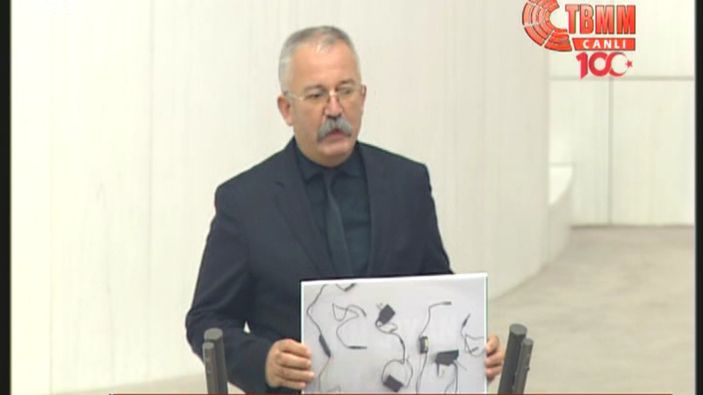 Elindeki fotoğrafta dinleme cihazı yer alan Turan, İstanbul il binalarının dinlendiğini belirterek açıklamalarda bulundu.