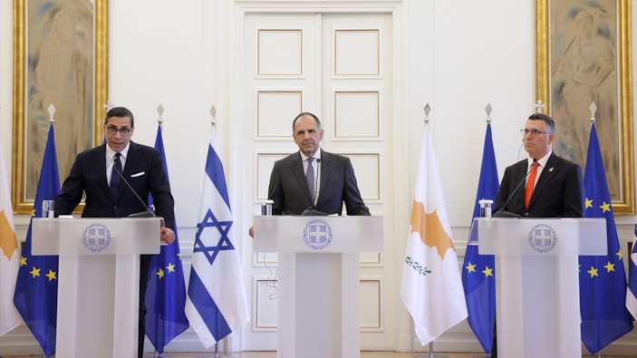 Doğu Akdeniz’de Türkiye’ye karşı ortak hareket eden ve "şer üçlüsü" olarak tanımlanan İsrail, Yunanistan ve Güney Kıbrıs Rum Yönetimi’nin dışişleri bakanları, Atina’da bir araya geldi.