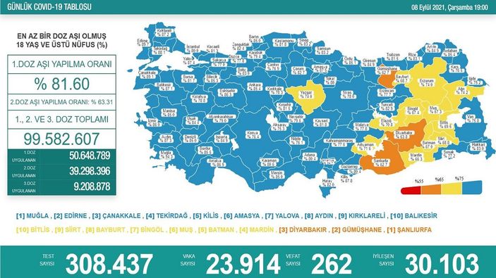 Sağlık Bakanı Fahrettin Koca'nın paylaştığı tabloya göre , Türkiye'de son 24 saatte 308 bin 437 Covid-19 testi yapıldı, 23 bin 914 kişinin testi pozitif çıktı, 262 kişi hayatını kaybetti.