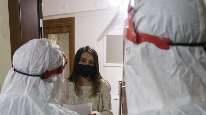 Filyasyon ekibinin, testi pozitif çıkan E.A.'nın (32) evine gittiği anları DHA görüntüledi. Koruyucu kıyafetlerini giyen sağlık görevlileri, kapıda sağlık durumunu sorduğu E.A.'ya tedavisi için ilaçlarını teslim ederek, uyması gereken kuralları anlattı. Filyasyon ekibi, E.A.'nın temaslı zincirini tespit etmek için de çalışma yaptı.