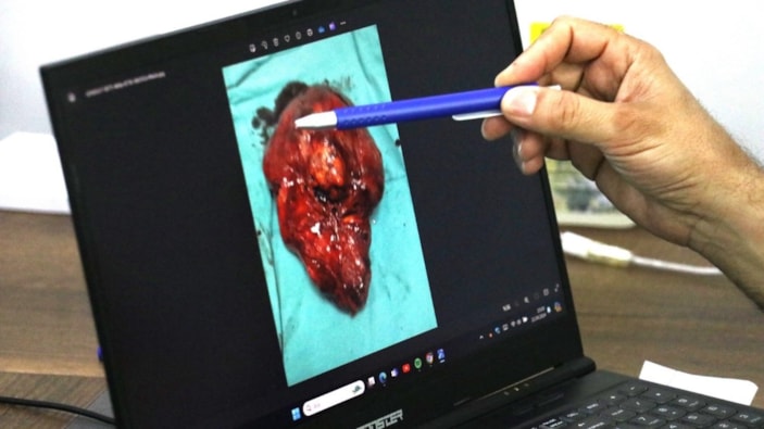 “Yapılan tetkiklerde hastanın sağ böbreğinde 20 santimetrelik bir kitle olduğunu tespit ettik. Bu böbrek kitlelerinden, bazıları genellikle gebelikte görülen iyi huylu kitlelerdir. Bu tümörler 4 santimetrenin üzerine çıktığında kanamaya meyilli böbrek tümörleridir. Bu hastanın 20 santimetre olan böbreği ciddi anlamda zarar görmüştü, hayati tehlikesi de söz konusuydu. Çünkü bu kanamalar çok ciddi ve ani olabiliyor. Hastamız geldiğinde çok ciddi anlamda kan kaybı da söz konusuydu. Hastamızı acilen ameliyata alıp hem kitleyi hem de böbreği almak zorunda kaldık. Erken dönemde gelmiş olsaydı bu kadar büyümeyecek ve böbreği kurtarılabilecekti. Bu kitle 3 kilogram ağırlığındaydı.